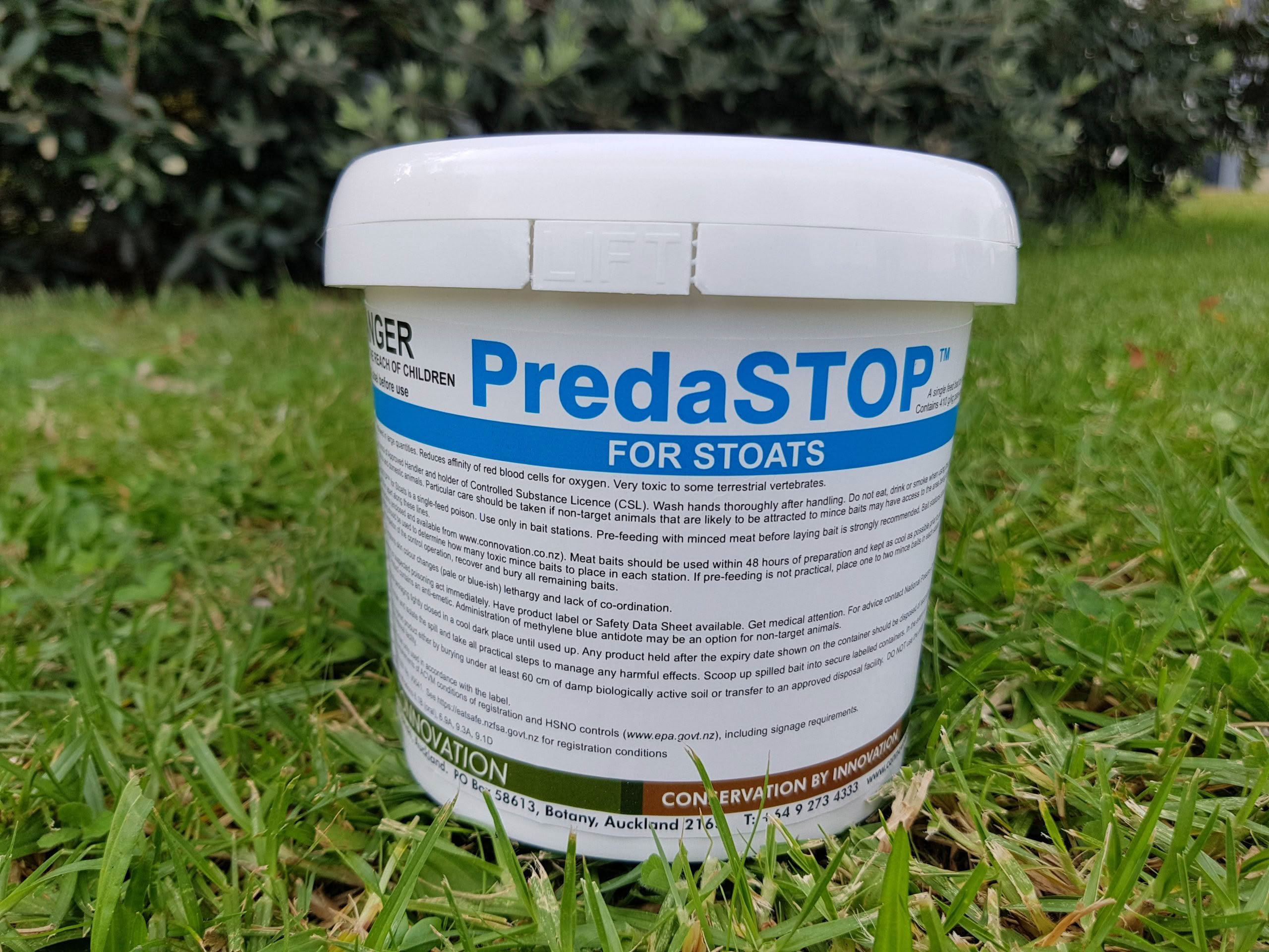 PredaSTOP is a green paste used as a bait for Stoats and Feral Cats. It contains para-aminopropiophenone also known as PAPP, which once consumed makes the predator lethargic and drowsy which then leads to death. PAPP converts the haemoglobin in red blood cells to methaemoglobin that blocks the flow of oxygen to the brain and heart.